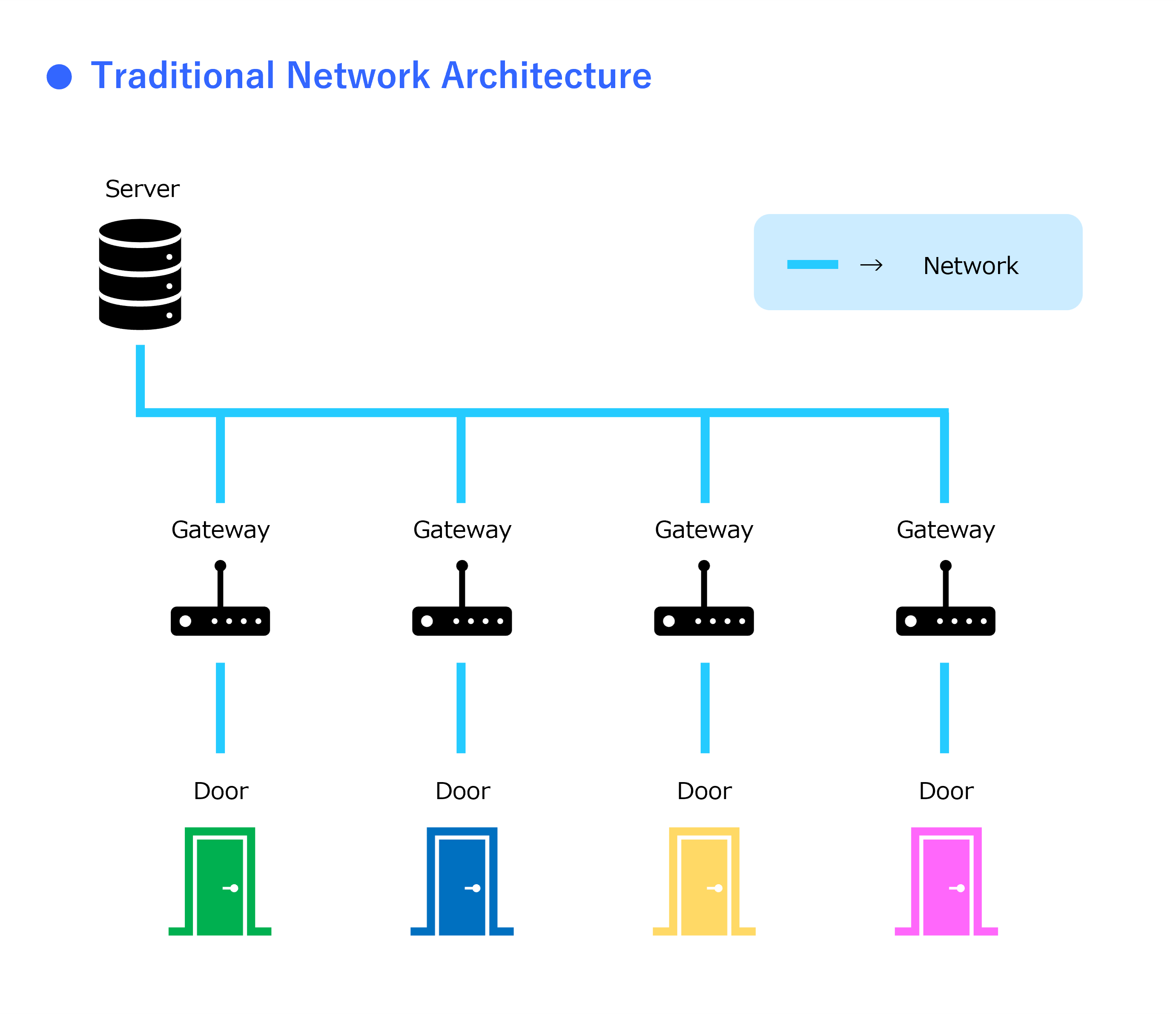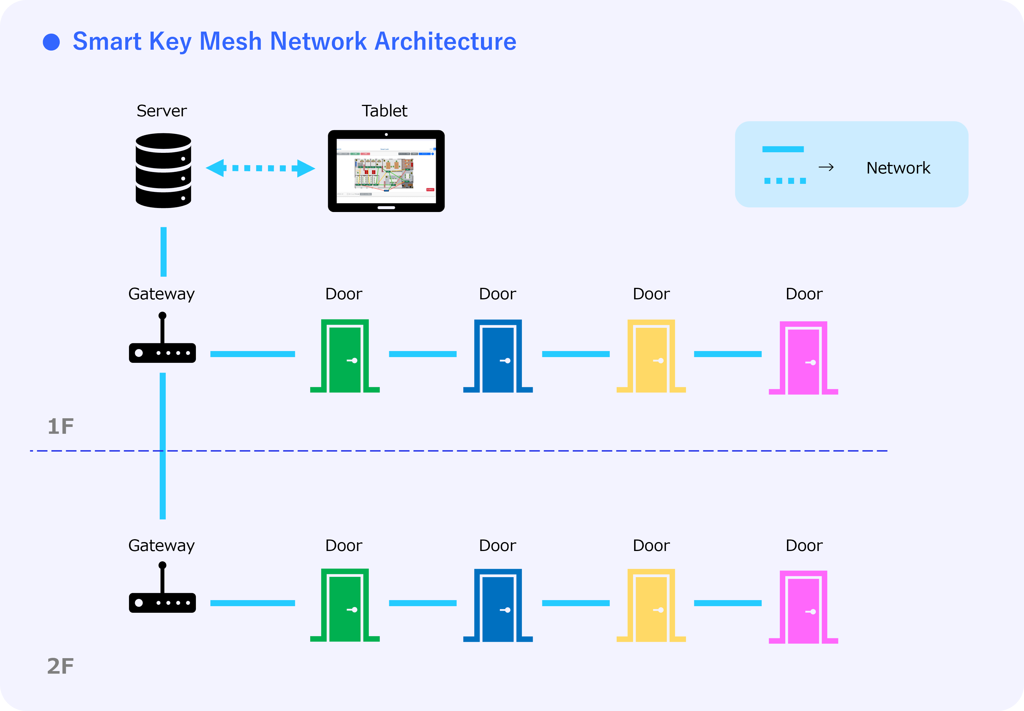 By utilizing wireless mesh network technology for smart keys, remote locking/unlocking and door status monitoring can be achieved seamlessly, even in large offices with obstacles.