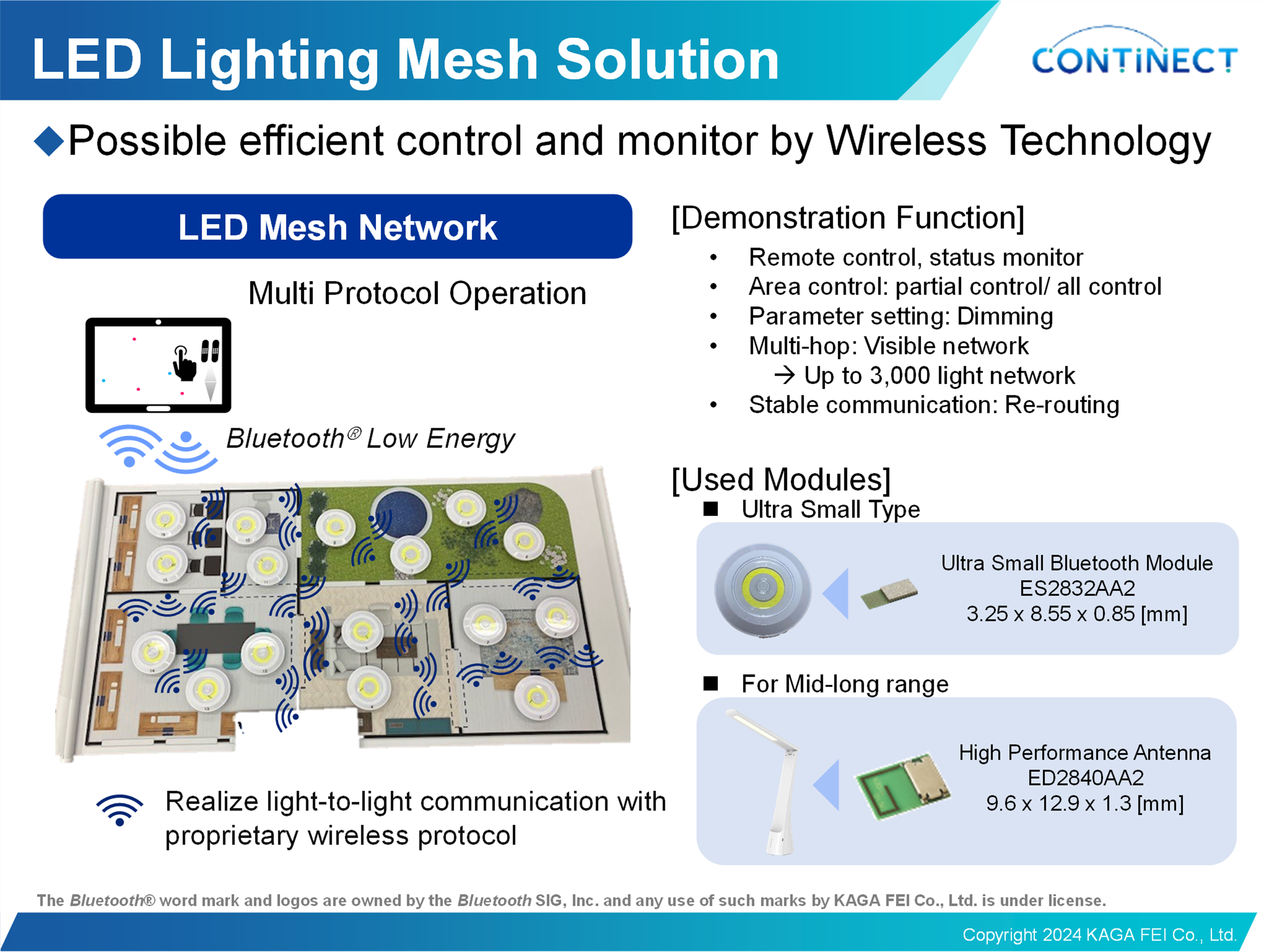 Our Bluetooth® low energy module with mesh network technology was installed in a commercial lighting device to complete the mesh network lighting demonstration system.