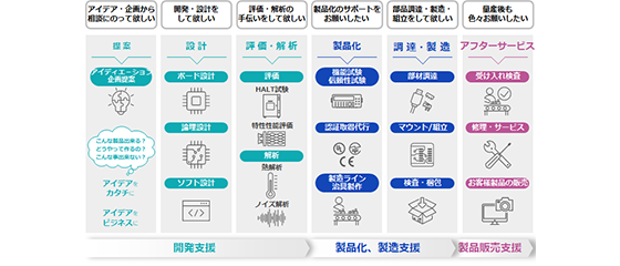 製品の企画提案からハード開発、ソフト開発、部品調達、製造、評価解析、アフターサービスまで幅広い範囲でお客様のご要望にお答えします。