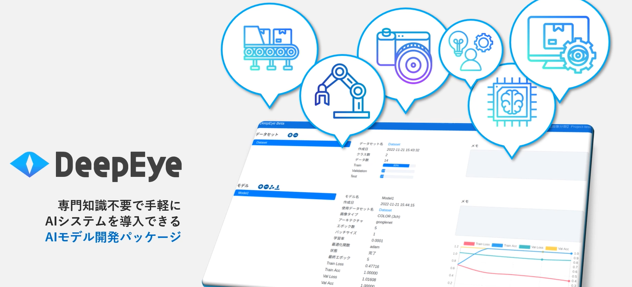 簡単に自前でAI学習が出来る“Deep Eye”。オンプレミスやクラウド環境で学習~精度評価を行い、出来上がったモデルをエッジPC向けにデプロイする事が出来ます。