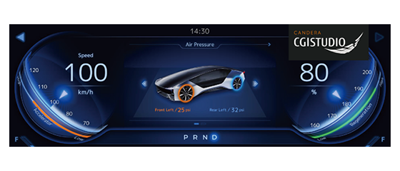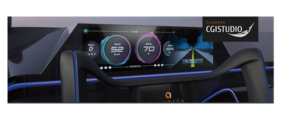 連続した1枚のディスプレイでメーター、ナビ、オーディオのシームレスな切り替えを実現し、人とクルマの新しい関係を表現しました。また、CGI Studioの多彩な3D機能により豊かな表現を実現しました。