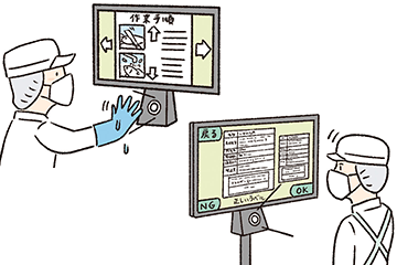オフィス端末や各工場の製造機器をタッチレスで操作。両手が塞がった状態で機器の操作が可能で操作履歴も記録できます。展示ブースでは、お客様による体験型デモ機をご用意しております。