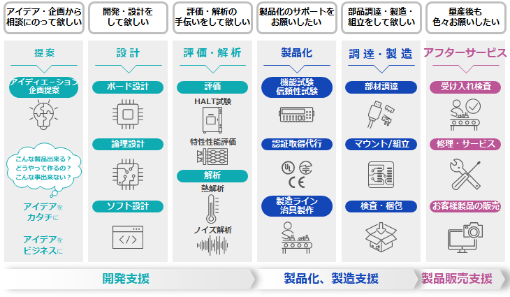 製品の企画提案からハード開発、ソフト開発、部品調達、製造、評価解析、アフターサービスまで幅広い範囲でお客様のご要望にお答えします。