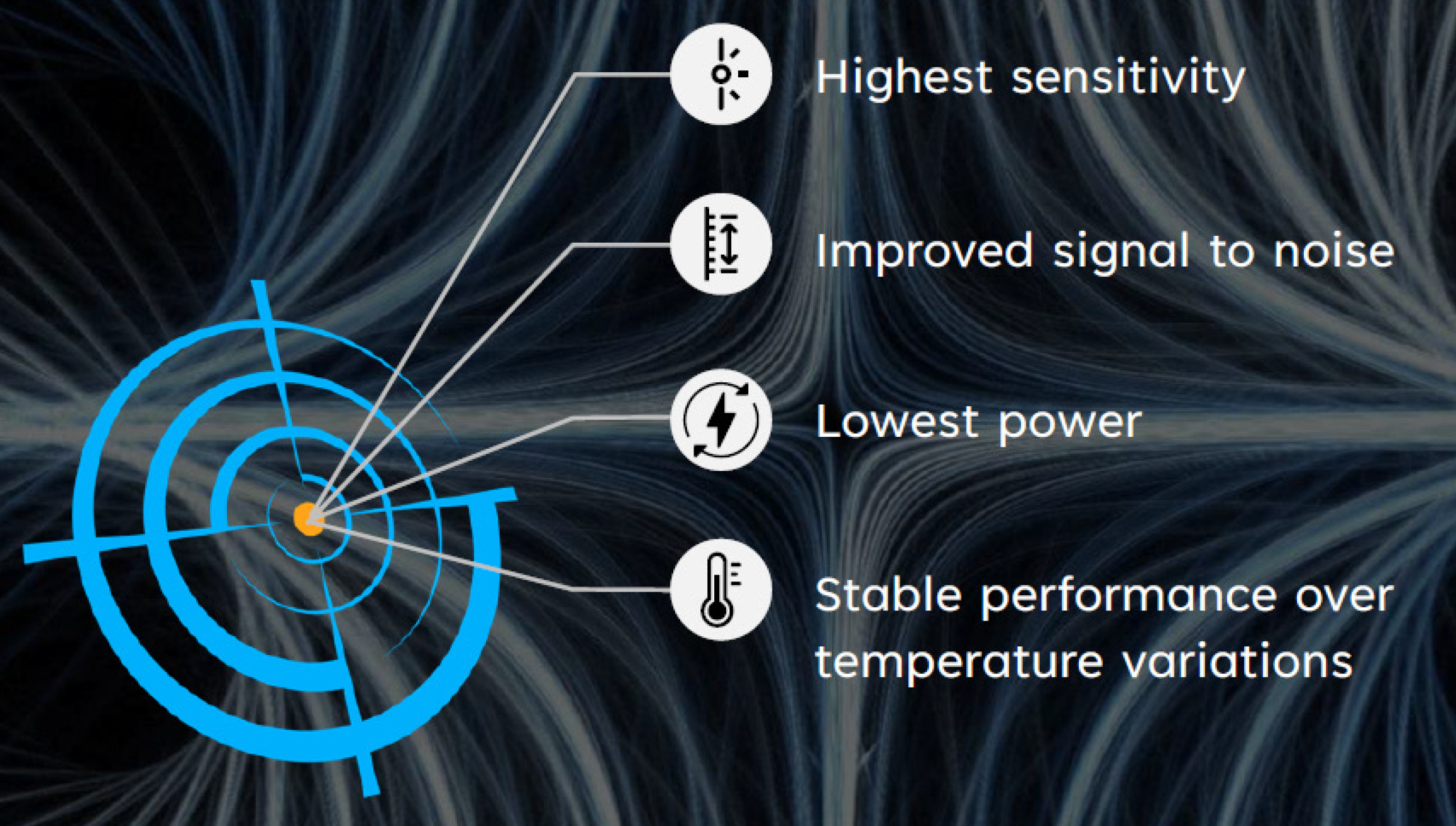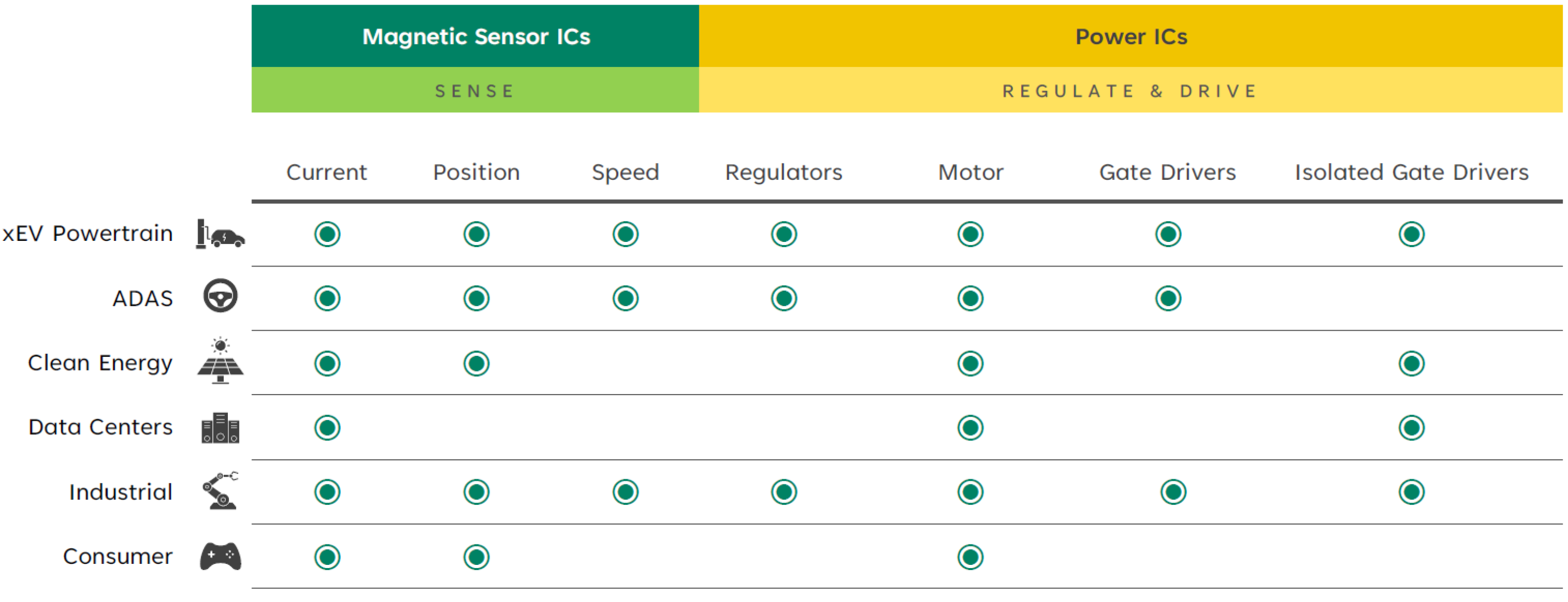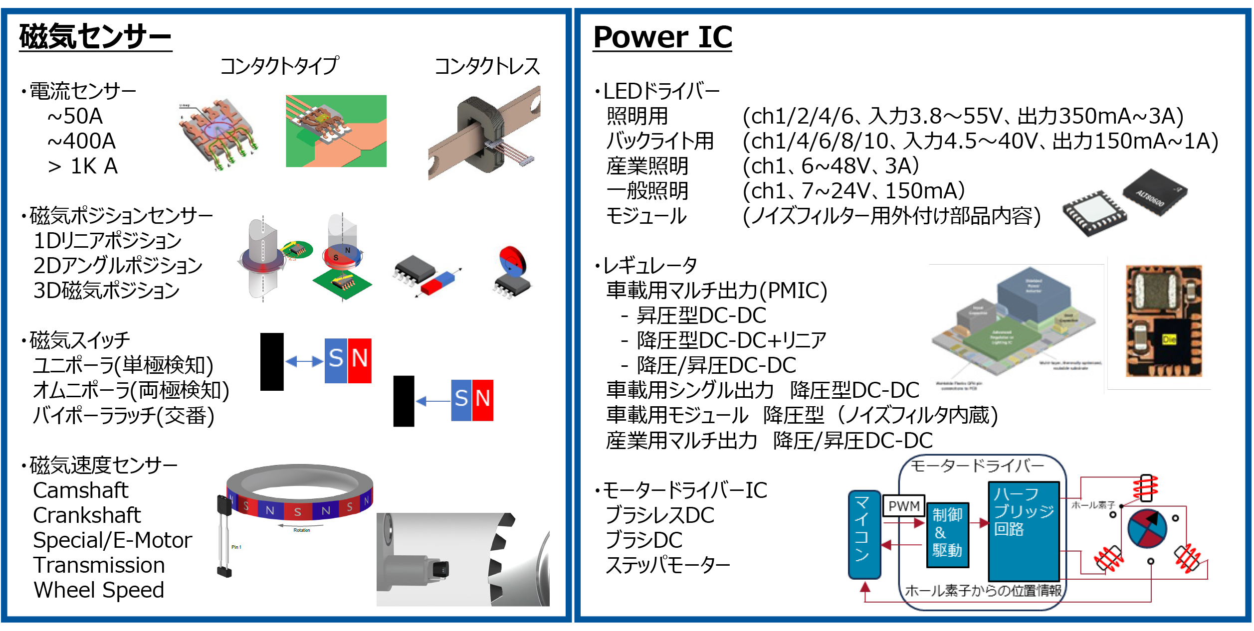 磁界の有無を検出する磁気スイッチから高感度、高精度で磁界を検出できるTMR技術を用いた磁気センサー、電流から発生する磁界を読み取る電流センサー、磁石の回転する角度を検出する回転角センサー、センサーレスBLDCモータードライバーといった製品を幅広くラインナップしています。