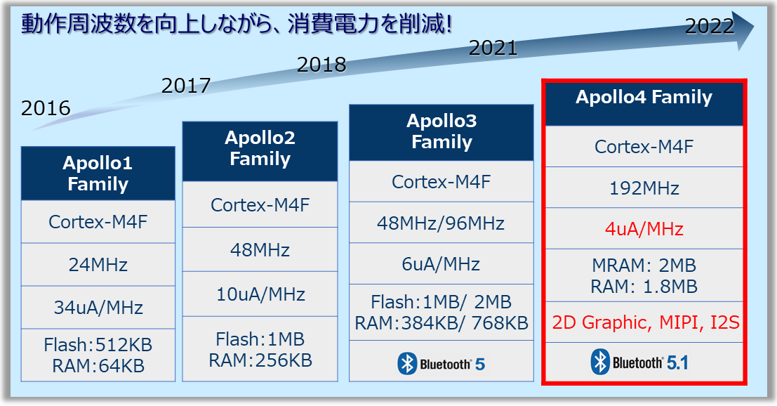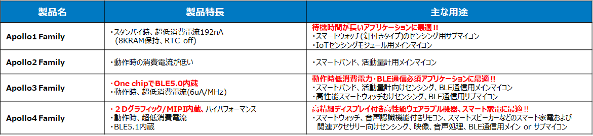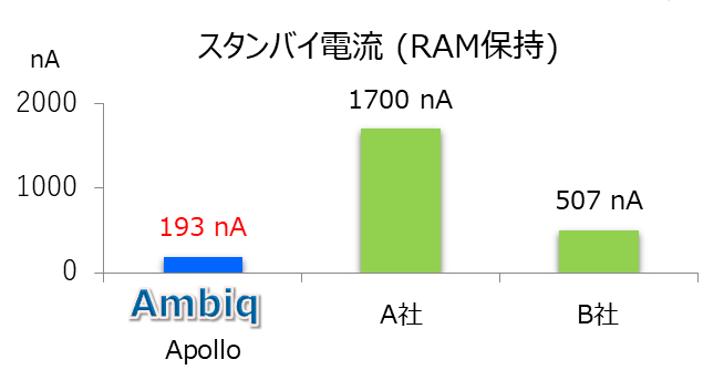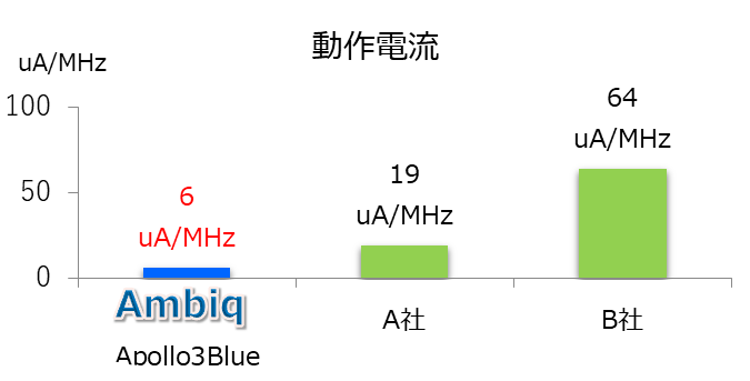 Ambiq Micro社は、独自の特許技術SPOT™プラットフォームを使用した超低消費電力MCU、SoC、RTCをリリース、業界トップクラスの動作時4uA/MHzを実現しています。