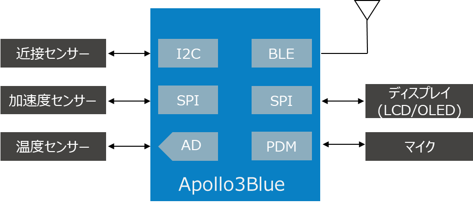センシングデータ処理、Endpoint AI向け高性能なARM®Cortex M4F、大容量メモリ(ROM、RAM) を搭載しながら、独自の特許技術SPOT™により業界トップクラスの低消費電力を実現しています。ウェアラブル、IoTなどのアプリケーション向けBLE、USB、GUI,MIPIなど豊富な周辺機能を内蔵しており、BGA、CSPなどPCB面積削減に最適なPKGを揃え、お客様のご要望に応じて製品提案ができます。