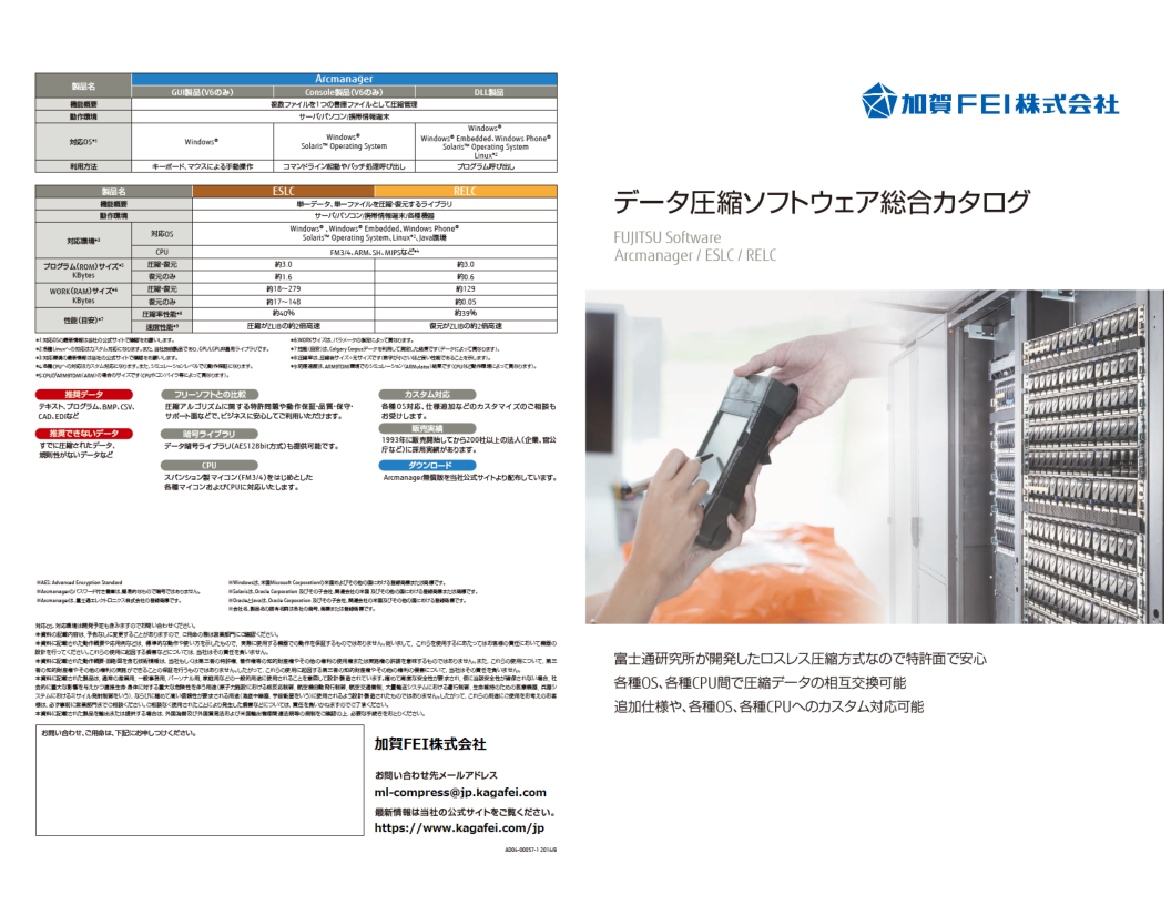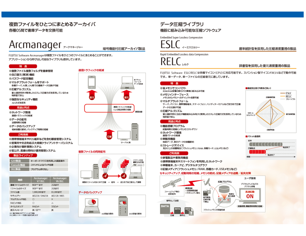 富士通研究所が開発した圧縮方式を採用していますので、圧縮アルゴリズムに関する特許問題や動作保証・品質・保守・サポート面などで、ビジネスに安心してご利用いただける製品です。