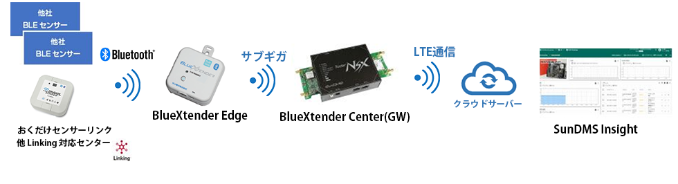 BlueXtenderは、工場、倉庫、建設現場、店舗、ビルなどあらゆる場所で、さまざまなBluetooth®センサーデータを取得し、920MHzサブギガ通信としてLTE通信で無線でも途切れない広域エリアにおけるセンサーデータの収集・記録・見える化を実現します。