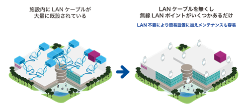 アクセスポイントの配置変更、追加が容易になるだけでなく設置工事の期間と費用を節約する事が出来ます。