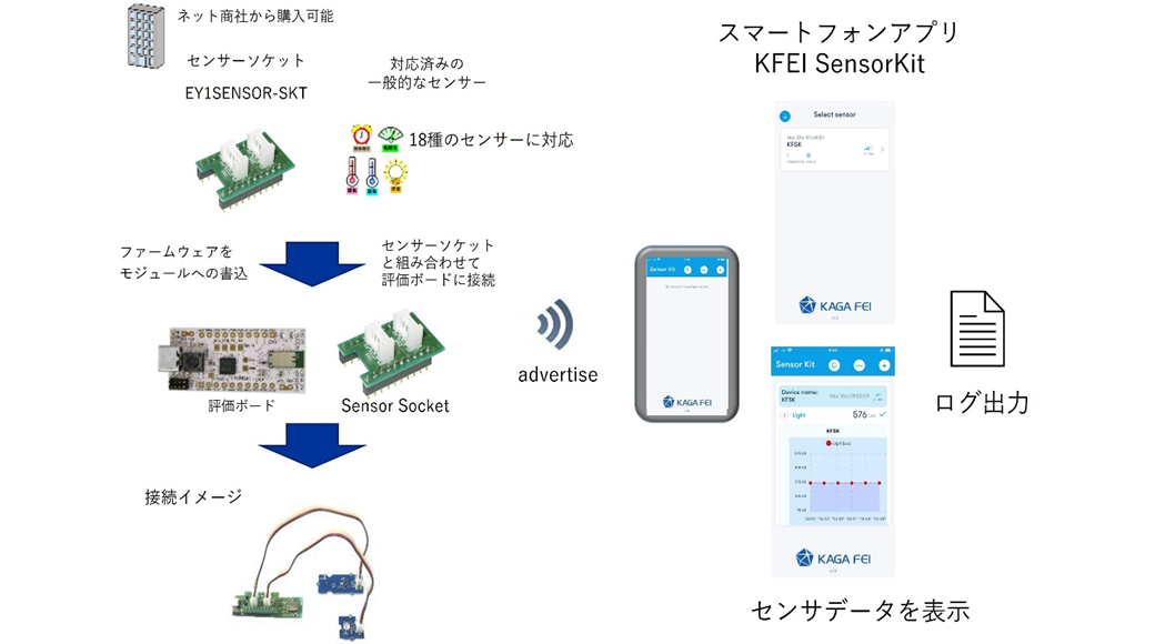 本製品は、センサーソケット「EY1SENSOR-SKT」、一般的なセンサー、Bluetooth® low energy 評価ボード/評価キット、弊社が提供するファームウェアを組みませてご使用頂く製品です。