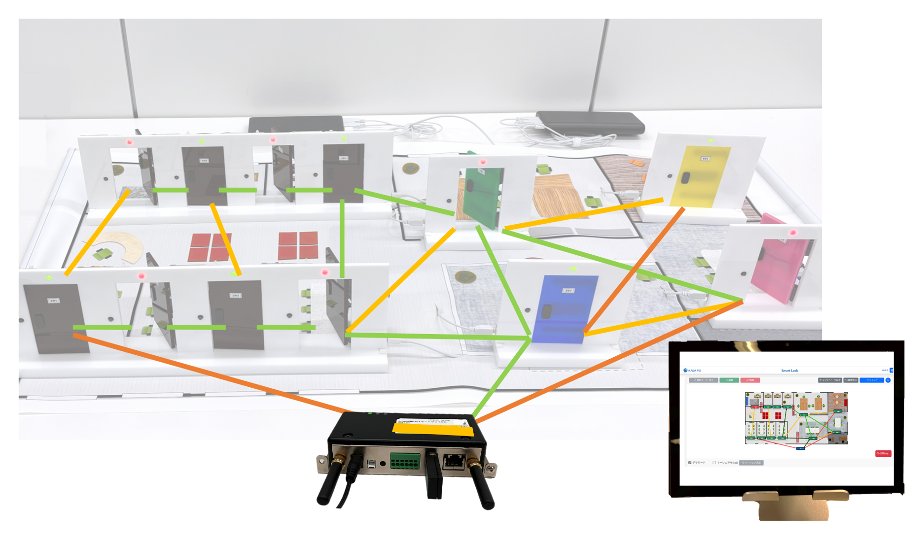 「デモンストレーションモード」に切り替えれば、施錠/解錠時に使用したネットワーク経路がアプリに表示されます。デモンストレーションモードではアプリで障壁の設定をすることもでき、設定後は障壁がない経路を使って施錠/解錠を行います。