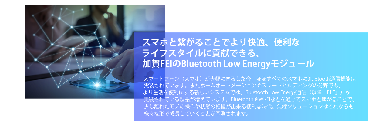 センサーデータや、スイッチのオンオフ通信等、比較的通信量が少ないデータの通信としては最適です。加賀FEIではBLEモジュールは20種類以上、Wi-Fiモジュールとコンボ(※)の製品もラインナップ。お客様の仕様に合ったモジュールが見つかります。