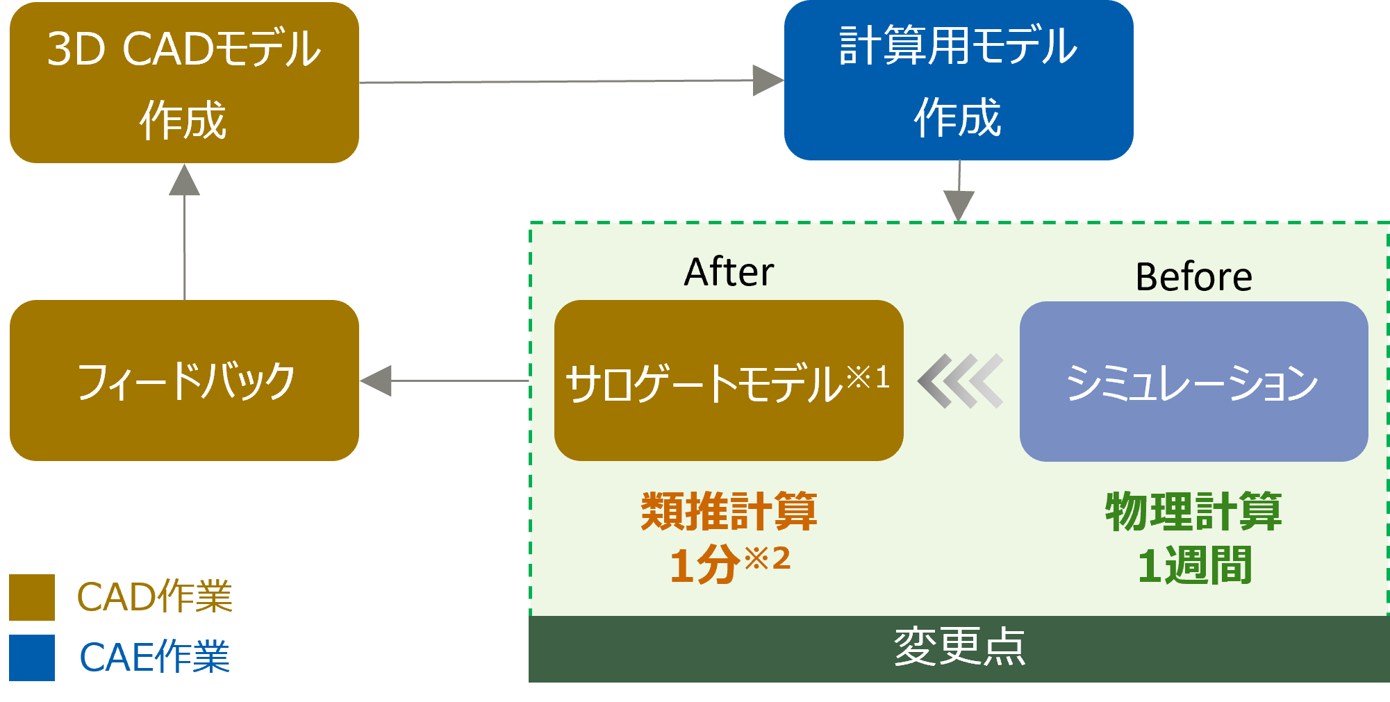 ※1:お客様から過去のCAEシミュレーション結果をご提供いただき、AIモデルの構築(事前学習)が必要です。