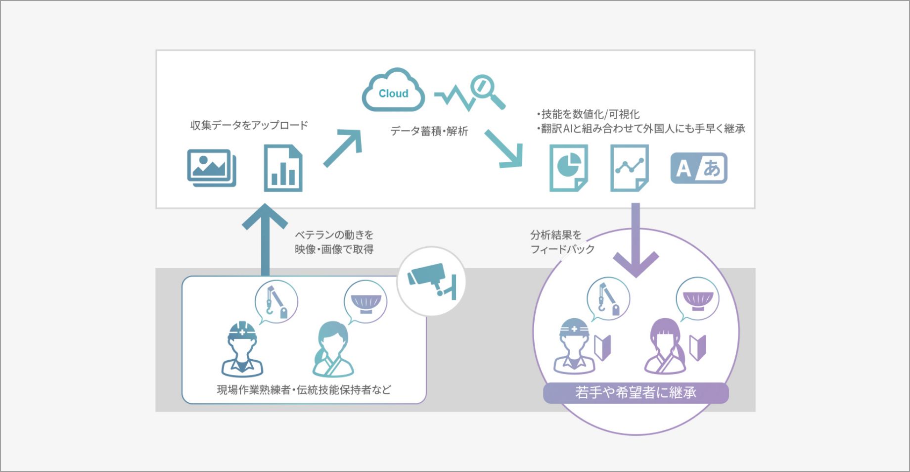 作業熟練者や特殊な伝統技能を持った職人の動きをカメラで捉え、画像・映像データをクラウドにアップロード。AI画像分析や音声分析を使い、熟練者本人も意識していなかった作業のコツを可視化・言語化します。効率よく作業をするポイントや熟練者ならではの技能を理解しやすくし、全体の効率アップや技能継承を推進します。またAI翻訳ソリューションを組み合わせることでスムーズな翻訳も可能、直接コミュニケーションが取りにくい外国の方にも有効です。言語の壁を超えて、若手だけでなく希望するすべての人に、これまで培ってきた技能を大切に伝えることができます。