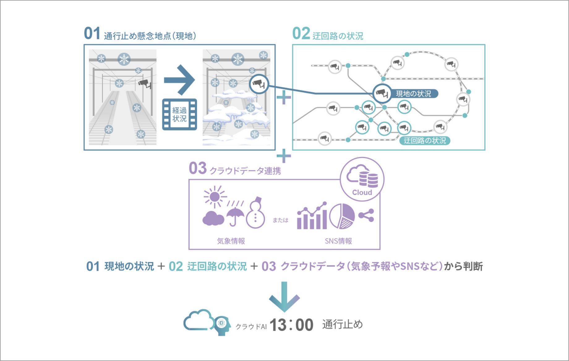 鉄道事故や道路上に設置されているネットワークカメラは、防犯(侵入者)や路上の落下物や異常を検知する目的で設置されております。交通インフラを管理する場合、ネットワークカメラの映像を自然災害(土砂崩れ、河川の増水、津波、浸水、地震、凍結、降灰など)による通行停止、規制の判断に活用しますが、規制を発動するタイミングは極めて難しく、早めに通行止め規制を行ってしまうと、規制後の人の滞留や、渋滞など混雑時間が長くなってしまいます。ネットワークカメラを各種クラウドサービスと連携させることより規制後の混雑時間を可能な限り短くし、最適なタイミングで通行止めを発動することが可能になります。規制の発動タイミングを懸念地点の映像のみで判断せず、迂回路のカメラ映像や気象情報、SNS情報(周辺施設のイベント実施情報など)等のクラウド上のデータやサービスと連携することで、天候をはじめとする周辺の様々な状況を加味した上で、通行止め規制のタイミングを計ることが出来ます。